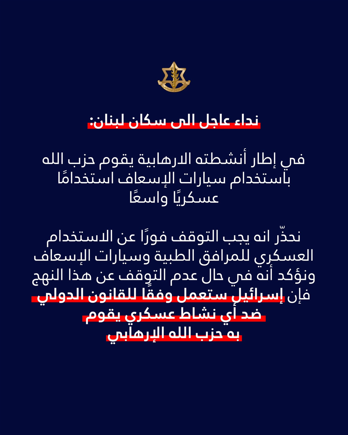 الجيش الاسرائيلي يُنذر: حزب الله يستخدم سيارات الإسعاف استخدامًا عسكريًا واسعًا!