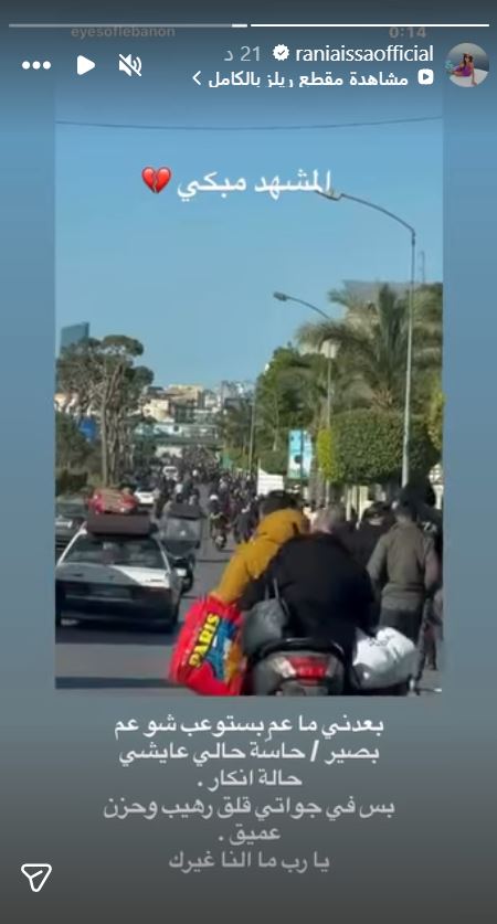 وأعادت رانيا عيسى نشر مقطع فيديو عبر خاصية القصص المصورة على انستغرام أظهر مشهد نزوح اللبنانيين من الضاحية الجنوبية لبيروت، وكتبت: "بعدني ما عم استوعب شو عم بصير، حاسة حالي عايشة حالة انكار. بس في جواتي قلق رهيب وحزن عميق. يا رب ما النا غيرك".