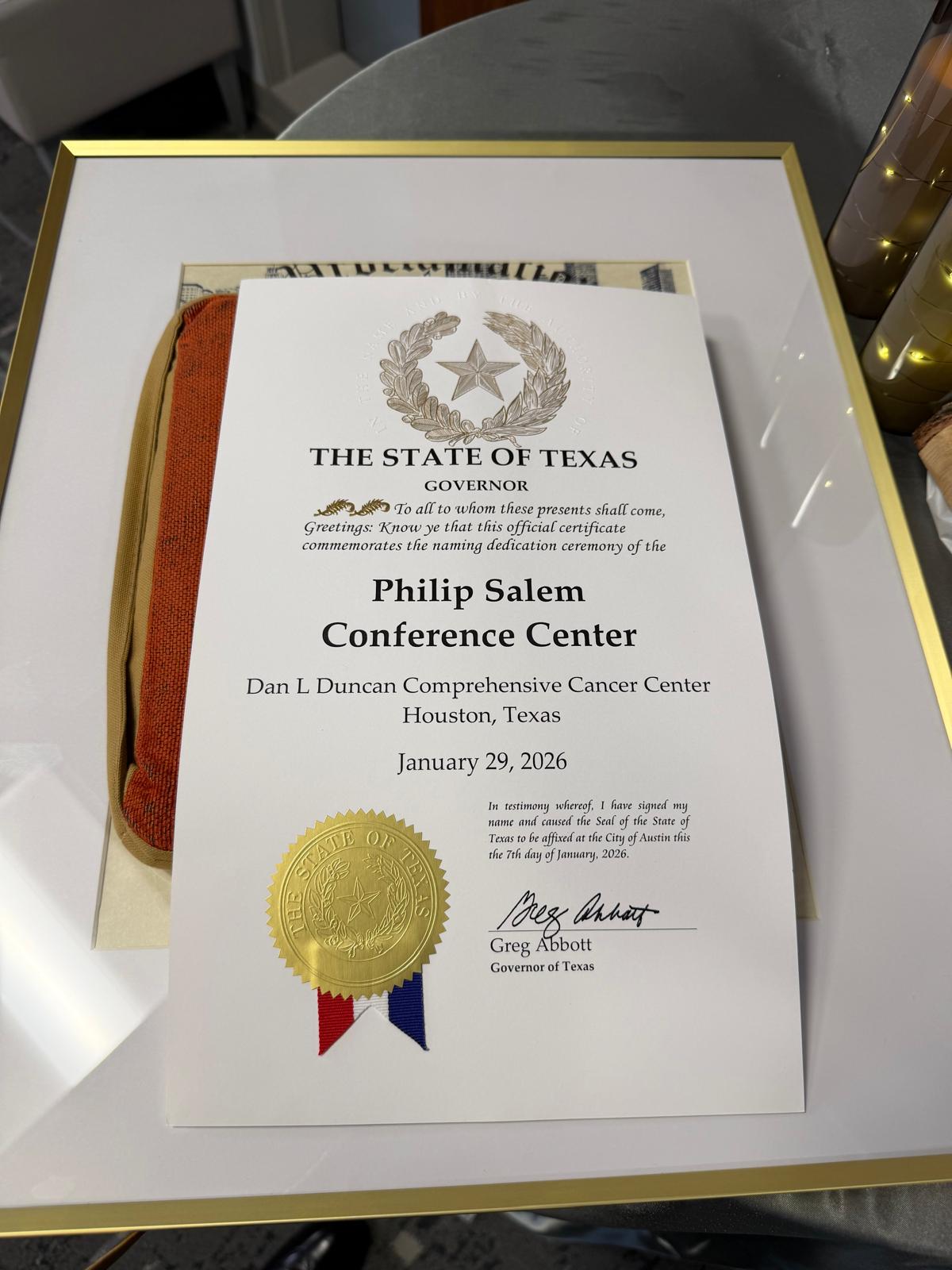 وتكريمًا للدكتور سالم وإِنجازاته في الأَبحاث السرطانية، أَطلقَت الجامعة اسمَه على مجمَّع هذه القاعات، وتَرافقَ هذا التكريم من المستوى الجامعي إِلى مستوى الولاية بإِصدار Greg Abbott، حاكم ولاية تكساس، قرارًا بإِعلان الخميس 29 كانون الثاني، يوم فيليب سالِم على مساحة الولاية كلِّها. (ومساحة ولاية تكساس هي 66 مرة أَكبر من مساحة لبنان).