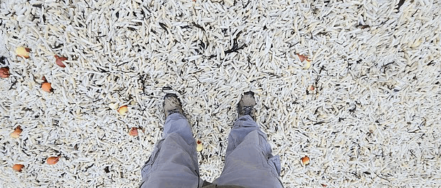 شهد أحد الشواطئ على الساحل الجنوبي لبريطانيا مشهداً غير مألوف، بعدما جرفت الأمواج ملايين رقائق البطاطا غير المطهية إلى الشاطئ يوم الأحد، ووصلت في بعض المناطق إلى أكثر من قدمين عمقاً (نحو 60 سم).
