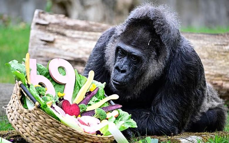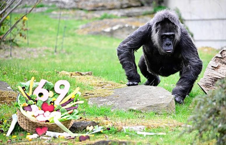 احتفلت أقدم غوريلا في العالم بعيد ميلادها التاسع والستين بوجبة دسمة يوم الاثنين الماضي، حيث تناولت الطماطم الكرزية والشمندر والكراث والخس في حديقة حيوان برلين.