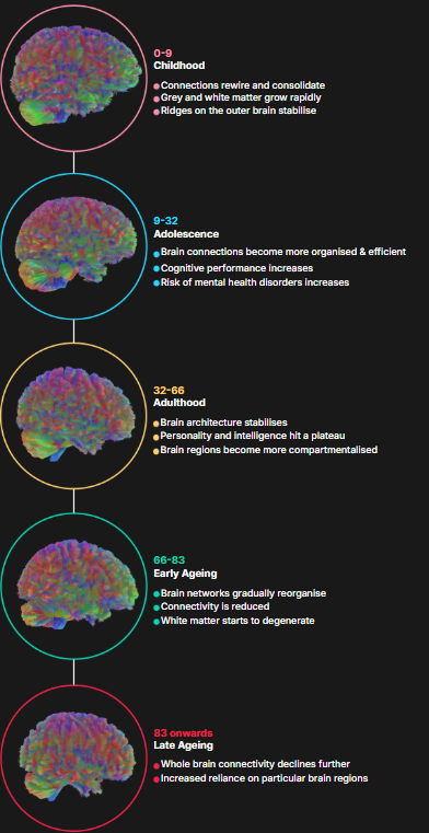 وتُظهر النتائج أنّ الدماغ يحتاج إلى قرابة 30 عامًا من "إعادة الأسلاك العصبية" قبل الوصول إلى مرحلة الاستقرار التي تبدأ عند منتصف الثلاثينات، حيث تبلغ القدرات المعرفية والشخصية مستوى ثابتًا لسنوات طويلة.